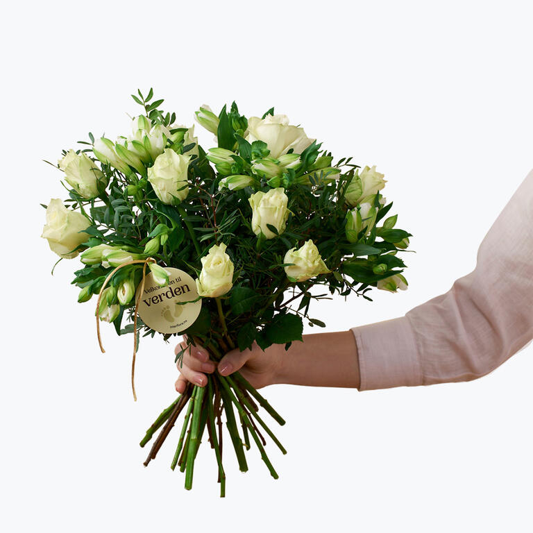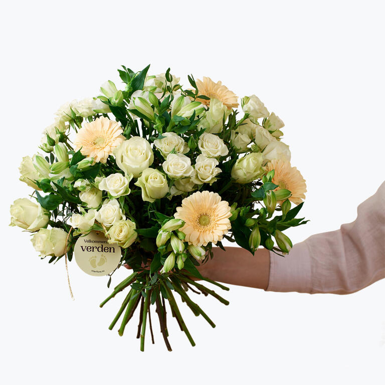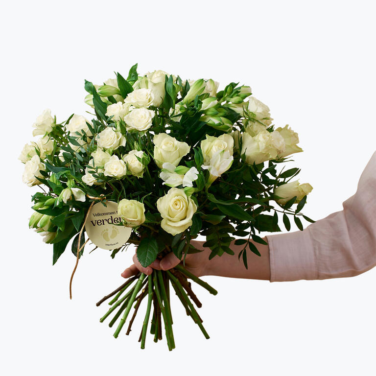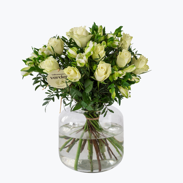 En harmonisk bukett som består av klassiske roser og alstromeria i hvitt/krem. En vakker hilsen med budskapet velkommen til verden som er passende å sende i forbindelse med en famileforøkelse!