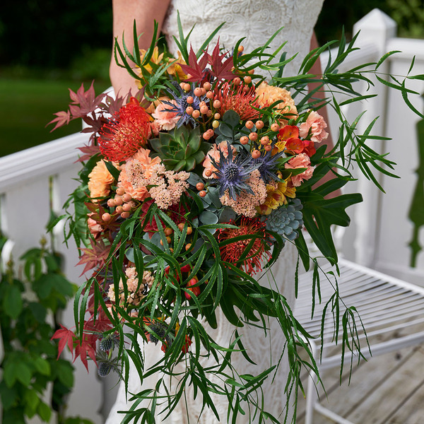 En vakker frodig bukett med et viltert uttrykk. Fantastisk bukett med mange ulike blomstersorter som gir spennende kontraster og en artistisk glød. Vis mer