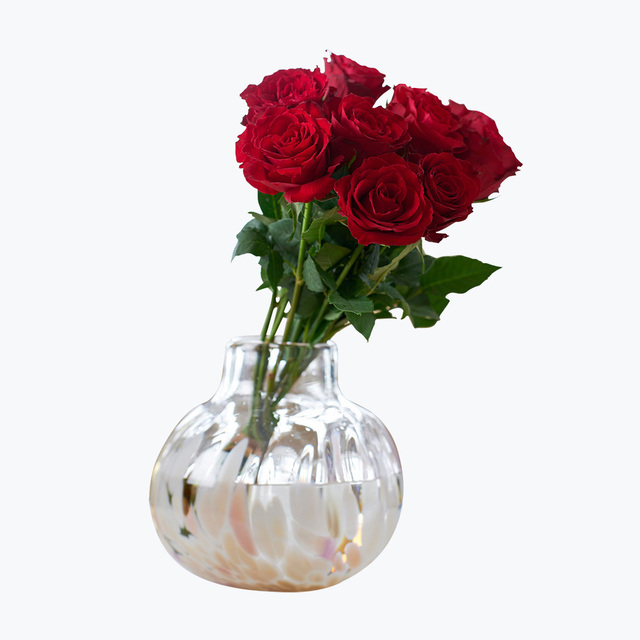 Krystallvasen Lykke fra Magnor er selve symbolet på gleden av å gi og få blomster. Hver vase har sitt unike preg og leveres i en flott gaveeske. Leveres med 10 vakre, røde roser.